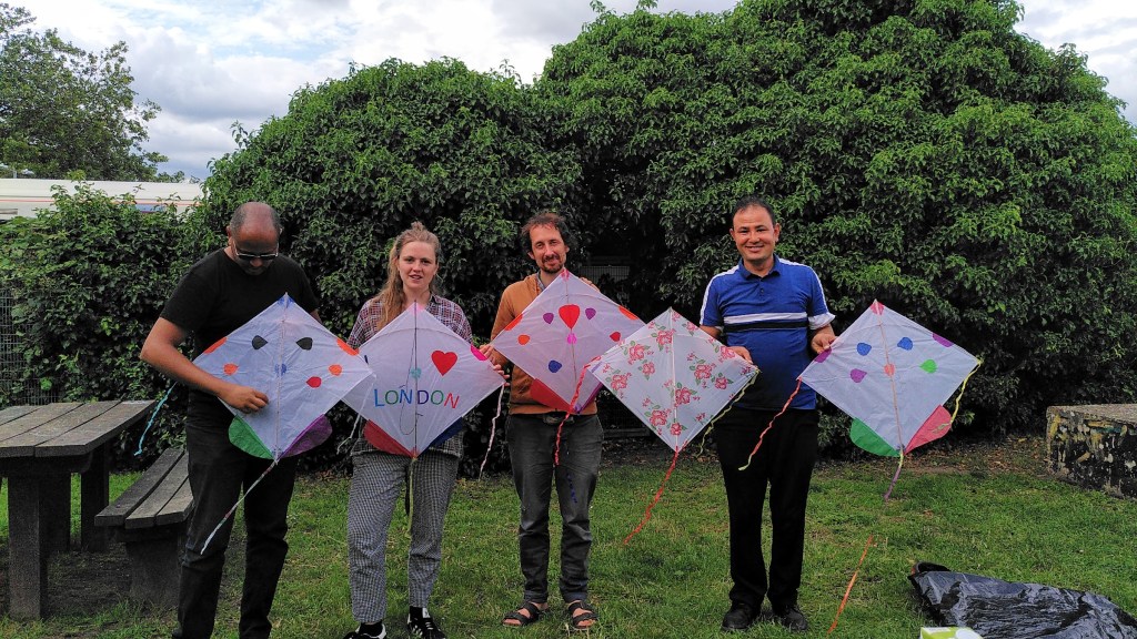 I gave my first kite making in the Copleston Centre in Peckham, South London in 2008, as part of an art group at the Southwark Day Centre for Asylum Seekers. Then from there I was introduced to the Horniman Museum and made a kite workshop for the children; there was snow on the ground but there was sunshine and we flew the kites.